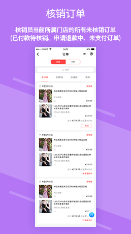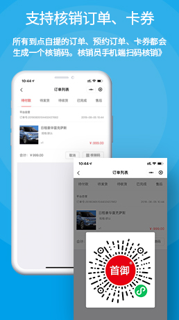 所有到店自提的訂單、預約訂單、卡券都會生成一個核銷碼,核銷員手機端掃碼核銷。